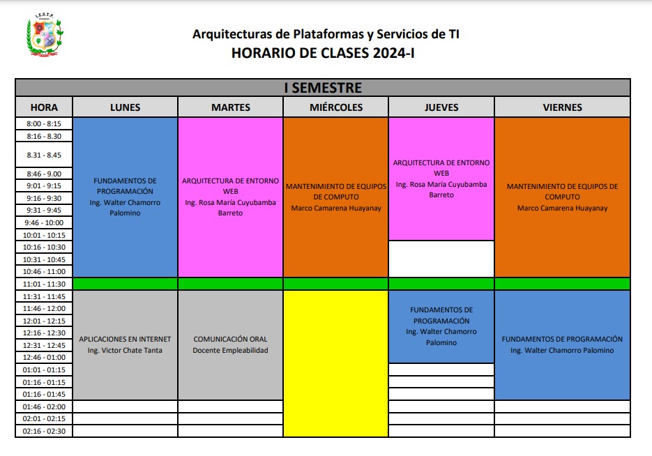 Este horario detalla las asignaturas específicas, los tiempos de inicio y finalización, así como los días de la semana en que se llevan a cabo las clases. Sirve como una herramienta organizativa crucial para estudiantes y profesores, facilitando la gestión del tiempo y garantizando una distribución equitativa de los recursos educativos para el aprendizaje efectivo.